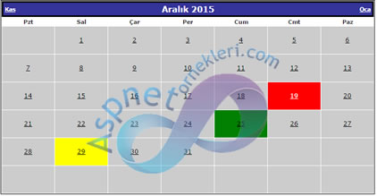 Asp.Net Calendar (Takvim) Kontrolünde Günleri Farklı Renklerde Gösterme